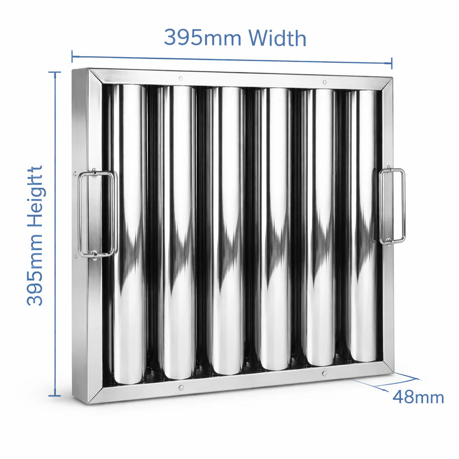 Keep your commercial kitchen safe and efficient with the Kitchen Canopy Baffle Filter 395x395mm (15.5"x15.5"). Manufactured from high-grade stainless steel, this filter is designed to trap grease effectively while maintaining maximum airflow through your extractor hood.