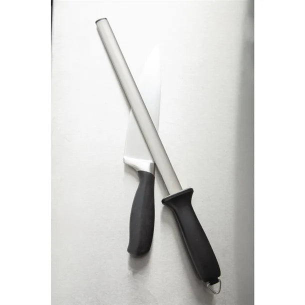 Designed with professional kitchens in mind, this 30.5cm diamond steel includes a comfortable, secure-grip handle that ensures complete control while sharpening. Its ergonomic shape helps maintain a safe, stable hold even during busy service. For added convenience, a hanging hook is built into the handle, allowing easy storage and keeping the steel close to hand whenever you need a quick hone.