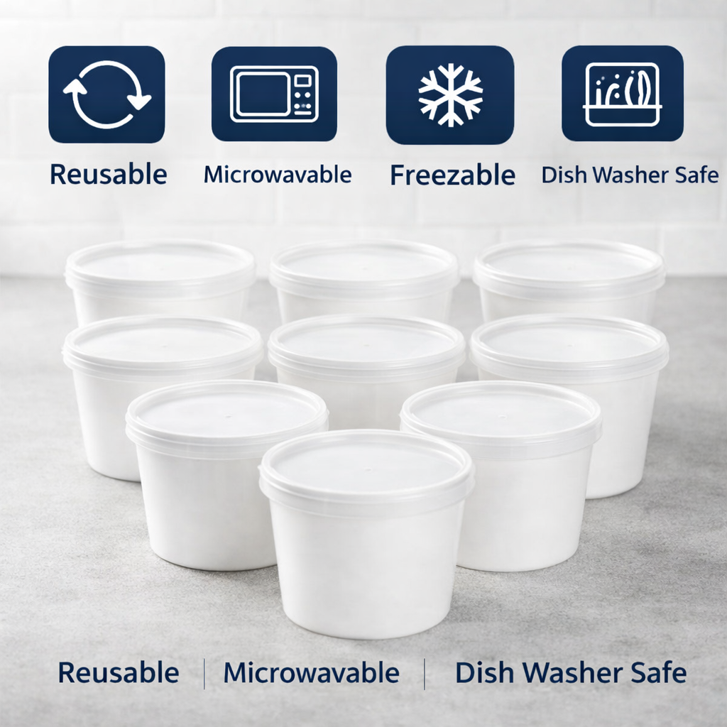 These 1 Litre Round Tamper Evident Containers with Lids (Pack of 10) provide reliable, professional food storage for takeaways, catering, and meal prep. Each container features a tamper-evident safety seal, giving customers confidence and protecting product freshness. Made from premium, food-grade polypropylene, they are microwaveable, freezer-friendly, and fully recyclable. Perfect for soups, sauces, curries, salads, and batch cooking. Durable, clear, and leak-resistant—ideal for commercial kitchens and food businesses.