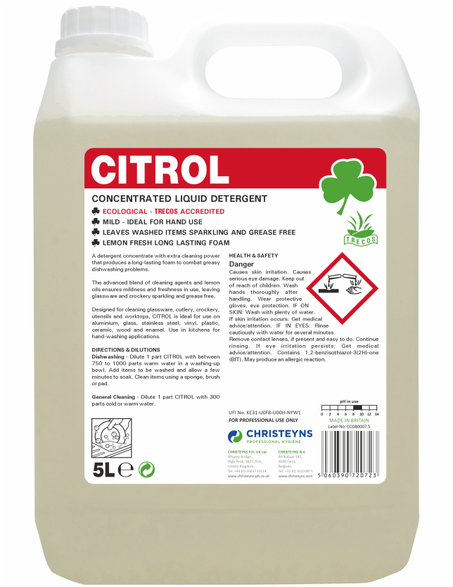 Christeyns Citrol – 20% Lemon Washing Up Liquid is a professional-strength dishwashing detergent designed for commercial kitchens and catering environments. This high-performance formula cuts through grease and food residue with ease, leaving crockery, glassware and utensils clean and sparkling. With a fresh lemon fragrance and long-lasting foam, Citrol is ideal for restaurants, cafés, schools and hospitality businesses. Available in convenient bulk sizes for cost-effective, high-volume use.