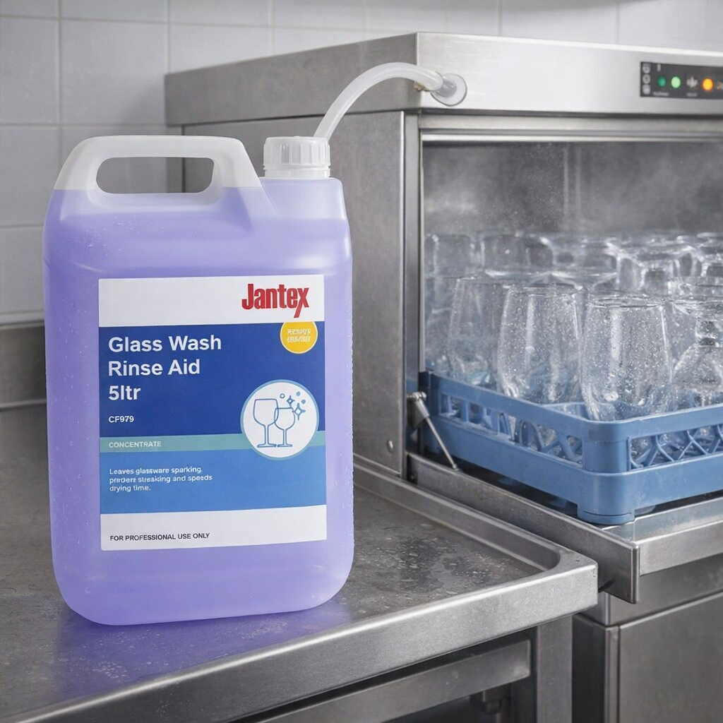 Achieve sparkling, streak-free glassware with the Jantex Glasswasher Rinse Aid Concentrate 5 Litre. Specially formulated for use in commercial glasswashers, this powerful rinse additive speeds up drying time and prevents water spots, streaks and residue build-up.